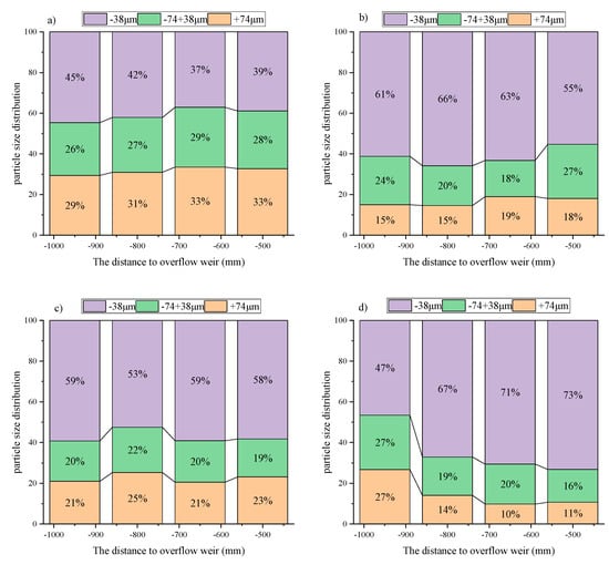 Figure 8d indicates that in the scavenger flotation cells of line II, the particle size distribution varies significantly across different sampling points. As the mineralized bubbles ascend, the proportion of fine-sized (−38 μm) minerals increases markedly. When correlated with the bubble load trend in Figure 7, it can be deduced that the scavenging process is dominated by the detachment of coarse particles (+38 μm) during the upward movement of mineralized bubbles.