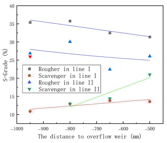 As illustrated in Figure 9, the bubble load measurement data reveal that the mineral grade trends in line I and line II are similar, with the exception of the first data point in the scavenging stage of line II, which was excluded as an outlier during trend analysis. In the rougher stage, the sulfur grade decreases progressively as the mineralized bubbles ascend, whereas in the scavenging stage, the sulfur grade increases. Furthermore, the sulfur grade in the rougher stage of line I is consistently higher than that of line II, while the sulfur grade in the scavenging stage of line I is lower than that of line II. This indicates that line I achieves superior separation efficiency compared to line II.