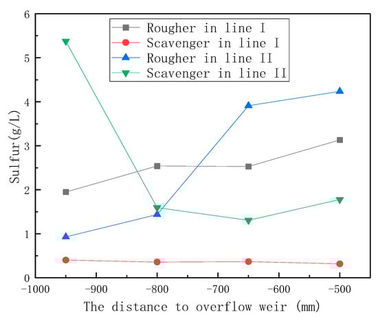 As the mineralized bubbles ascended, the metal content in the bubble load was quantified, specifically measuring the mass of sulfur per liter of gas (g/L). The analysis results, depicted in Figure 10, reveal that the sulfur content in the bubbles increases during the rougher stage but decreases in the scavenging stage. Although the trends in line I and line II are consistent, the magnitude of variation in line II is notably larger than that in line I across all flotation stages.