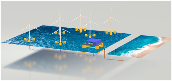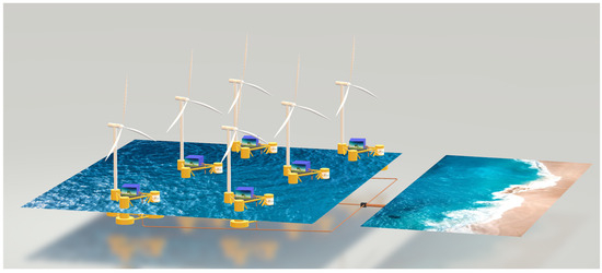Figure 1. Scheme of the ORCH2P (offshore renewable centralised hydrogen production with pipeline) system configuration for a floating offshore wind farm. Under the sea level, the intra-array electrical cables are coloured blue, while the export pipeline is coloured brown (Source RSE). - The hydrogen production system is decentralized and is directly installed on the turbine platforms/foundations. Hydrogen is transported from the turbines to a central collection point via small pipelines (shown in brown) and then delivered to shore through a larger “export” pipeline [37]. This configuration is identified by the acronym ORDH2P (offshore renewable decentralized hydrogen production with pipeline). A simplified schematic of this setup is presented in Figure 2.