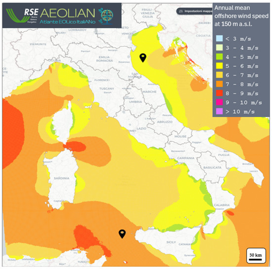 To conduct the initial techno-economic evaluations of offshore hydrogen production, two offshore wind sites representing different contexts in Italy were selected. These sites, located off the coast of the Sicily and Emilia-Romagna Regions, are shown in Figure 4, along with a map of the annual average wind speed at 150 m above sea level (a.s.l.) extracted from AEOLIAN, the wind atlas of Italy developed by RSE [38].