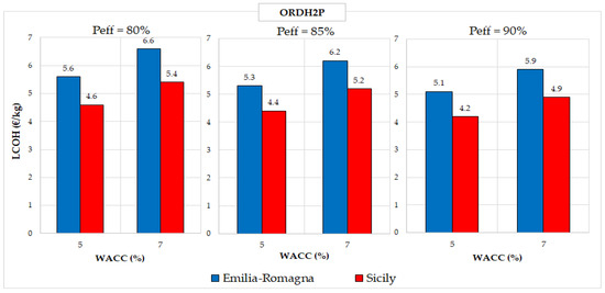 LCOH for the ORDH2P configuration at varying Peff (80%, 85%, 90%) and WACC (5%, 7%). Blue: Emilia-Romagna; red: Sicily.