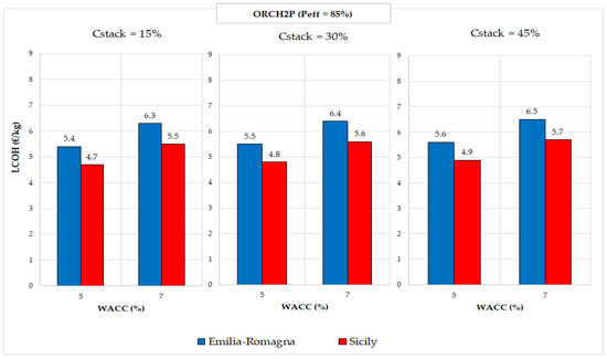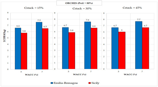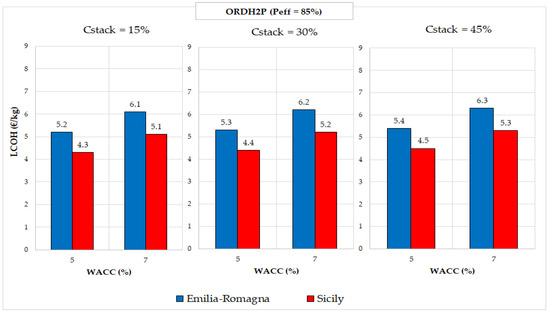 To better illustrate the impact of varying Cstack on the results obtained across various case studies and configurations, Figure 8, Figure 9 and Figure 10 present bar charts summarising the values listed in Table 10 and Table 11. These charts depict the LCOH, expressed in EUR/kg. The blue bars represent the values associated with the Emilia-Romagna case, while the red bars correspond to the Sicily case. Specifically, Figure 8, Figure 9 and Figure 10 report the results of LCOH calculated varying WACC and Cstack value, respectively, for the ORCH2P, ORDH2P, and ORCH2S configurations.