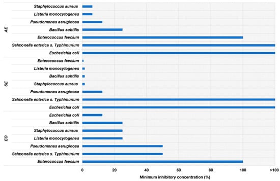 Minimum inhibitory concentrations of aqueous extract (AE), supercritical extract (SE) and essential oil (EO) in %.