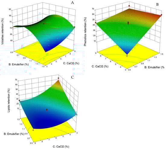 Response surface plots of volatiles (A), phenolics (B) and lipids (C) retention as a function of emulsifier and CaCl2 amount at a constant temperature of 38 °C. The color gradient represents the response value from lowest (blue) to highest (red) while dots represent actual experimental data points.