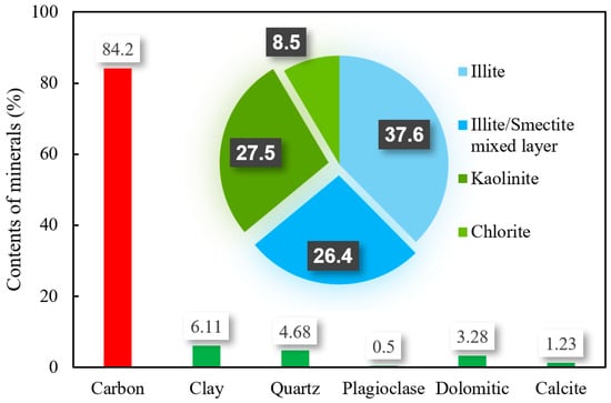 All coal samples used in this study were collected from deep coal seam N0.8 of the Benxi Formation in the Ordos Basin, with a depth of approximately 3500 m. Pulverized coal samples were prepared for X-ray diffraction (XRD) analysis and expansion rate tests to characterize the mineral composition of the coal and evaluate the hydration dispersion and expansion behaviors under different working fluids. Cylindrical core samples, approximately 5 cm in length and 2.5 cm in diameter, were prepared for rock mechanic compression tests to evaluate the mechanical strength of the coal. Irregular coal samples were extracted along the natural fractures to perform friction coefficient tests, assessing the lubrication effects of various working fluids on structural weak planes.