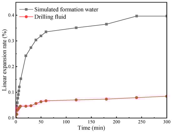 In this study, coal samples from coal seam No. 8 of the Benxi Formation were subjected to linear expansion tests in simulated formation water and drilling fluid at 110 °C. As shown in Figure 4, the linear expansion ratio of coal rock pressed tablets reached 0.396% after 5 h of immersion in simulated formation water and 0.077% after immersion in drilling fluid for the same duration.