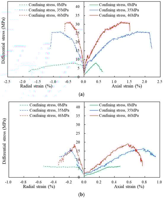 To investigate the impact of drilling fluid infiltration on the mechanical properties of coal rocks, a triaxial stress-loading experiment was conducted using the MTS rock mechanics testing system. The experiment covered the complete stress–strain response of coal rocks under triaxial stress conditions. The triaxial compression test results, as shown in Table 2, indicate a reduction in both Young’s modulus and the compressive strength of coal rocks after drilling fluid immersion. For instance, at a confining pressure of 0 MPa, Young’s modulus of coal rocks decreased from 1988.1 Mpa to 1676.1 Mpa, and the compressive strength dropped from 7.9 Mpa to 6.5 Mpa, with degradation rates of 15.69% and 17.72%, respectively. This demonstrates that drilling fluid immersion weakens the mechanical strength of coal rocks, making them more susceptible to deformation. This reduction in strength and Young’s modulus has been widely observed in both laboratory and field experiments [27,28].