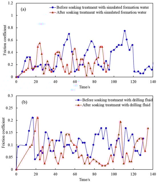Friction coefficients of coal rock before and after treatment with different working fluids, (a) treatment with simulated formation water and (b) treatment with drilling fluid.
