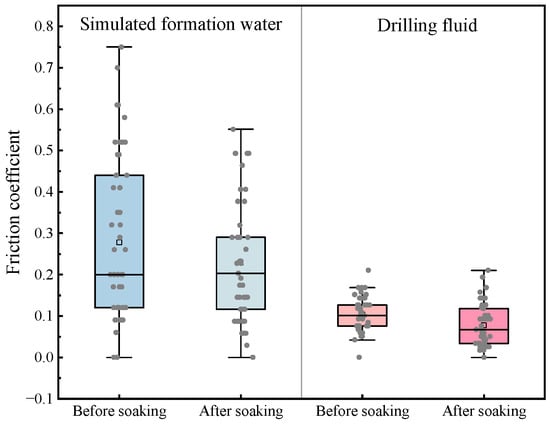 As shown in Figure 8, the box plot illustrates the distribution of friction coefficients under different treatment conditions, providing insights into the effects of simulated formation water and drilling fluid on coal rock sliding resistance. Before treatment, the friction coefficients exhibited a broad distribution range, with a relatively high median value and significant data dispersion, as indicated by the large interquartile range (IQR). The presence of numerous outliers suggests substantial variability in friction measurements, likely influenced by surface roughness and heterogeneity in coal rock contact areas.