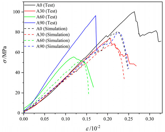Comparison of stress–strain curves between experimental and numerical simulations.