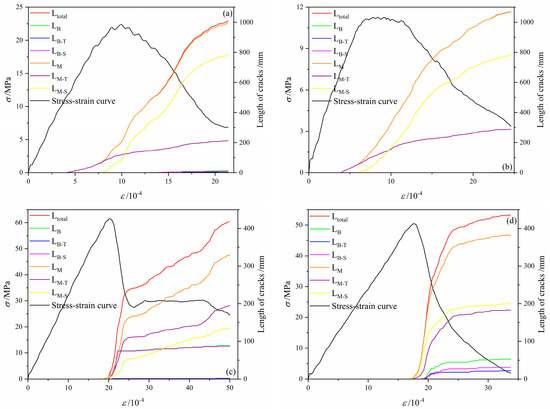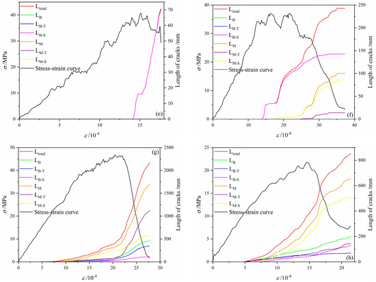 First, the cracks’ initiation, propagation and penetration processes of typical numerical layered limestone under external loading are analyzed in detail, as shown in Figure 5 and Figure 6. In Figure 5, Ltotal, LB, LB-T, LB-S, LM, LM-T and LM-S represent the length of total cracks, the length of cracks along the bedding, the length of tensile cracks along the bedding, the length of cracks along the matrix, the length of tensile cracks along the matrix, the length of shear cracks along the matrix, respectively. The detailed analysis is as follows: