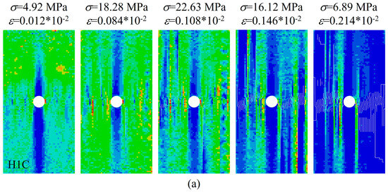 (1) At A0 and H1C, tensile cracks along the matrix are first found around the hole (σ = 12.71 MPa and ε = 0.042 × 10−2) and will propagate gradually with the increasing stress value. At σ = 18.87 MPa and ε = 0.076 × 10−2, shear cracks along the matrix are found, and LM-S will increase rapidly, as the increasing rate is faster than that of tensile cracks along the matrix. Correspondingly, cracks along the matrix can be clearly found at the left and right sides of the hole, and the length of cracks will increase constantly. With the increasing stress value, the cracks at the left and right sides of the hole will propagate to the up and bottom boundary of the numerical specimen. When the numerical specimen fails, the cracks are mainly along the matrix, the cracks’ type is mainly shear cracks, and the length of cracks along the bedding is very small.