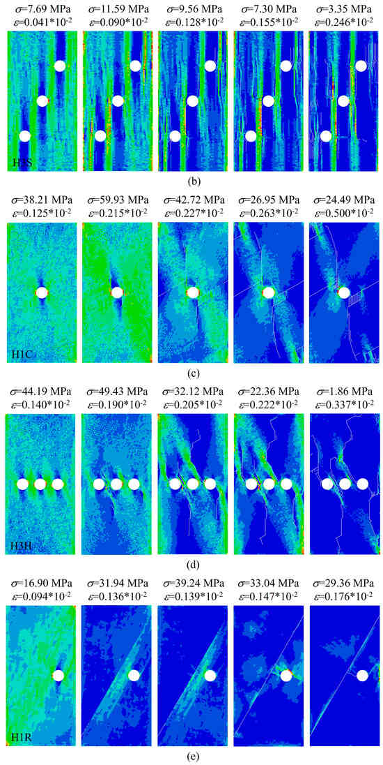 At H3S, the cracks will mainly initiate at the three holes and then propagate, and the three holes will gradually connect through the cracks’ initiation and propagation. During the loading process, other cracks will initiate at the cracks between the central and up right holes and then gradually propagate to the upper left of the numerical layered limestone specimen.