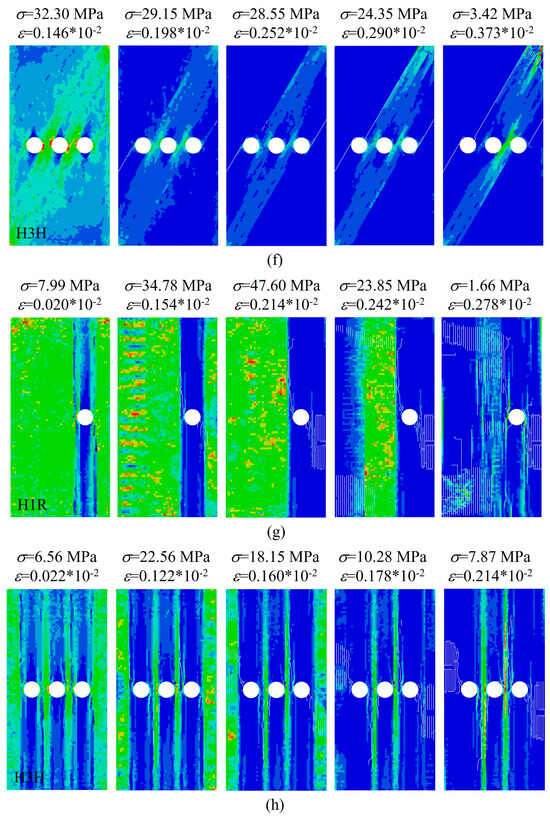 The evolution of the whole process of the crack’s initiation, propagation and penetration of layered limestone under a uniaxial compression test based on the Mises stress cloud map: (a) A0 and H1C; (b) A0 and H3S; (c) A30 and H1C; (d) A30 and H3H; (e) A60 and H1R; (f) A60 and H3H; (g) A90 and H1R; (h) A90 and H3H.