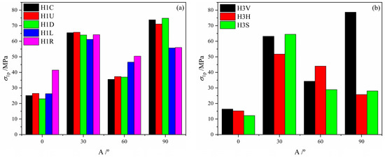 Figure 7 shows the peak stress of numerical layered limestone under different conditions. To quantitatively characterize the effect of holes on peak stress, the decrease rate (DR) of numerical layered limestone with holes with respect to the intact layered limestone is introduced. Each DR value of numerical layered limestone with holes is shown in Figure 8. The detailed analysis is as follows: