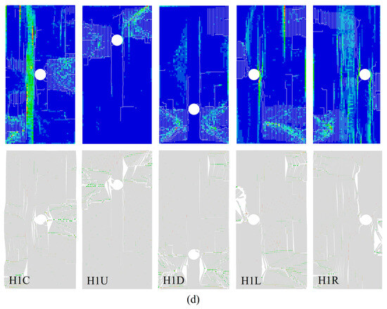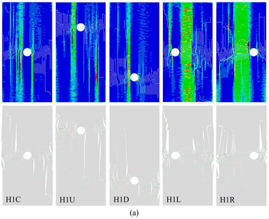 The final failure patterns of the numerical layered limestone with a single hole are shown in Figure 9. The detailed analysis is as follows: