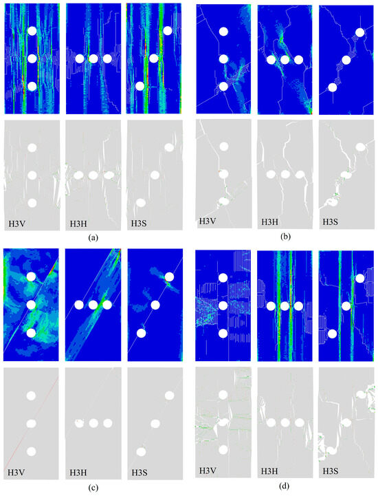 The final failure patterns of the numerical layered limestone with three holes are shown in Figure 10. The detailed analysis is as follows: