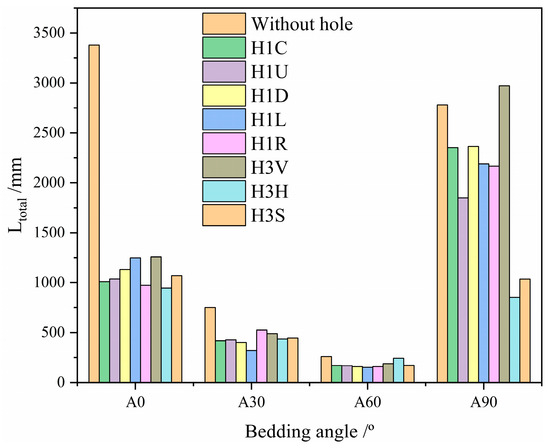 The length of total cracks can characterize the failure characteristics of the numerical specimen to a certain extent. Figure 11 shows the length of total cracks under different conditions. It is clearly seen that both the bedding angle and the hole have strong influences on the length of total cracks when the numerical specimen fails. The detailed analysis is as follows: