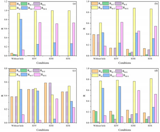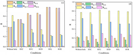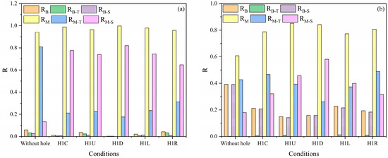 The influence of holes on the ratios of different types of cracks in layered limestone is further studied (as shown in Figure 12 and Figure 13). In Figure 12 and Figure 13, RB, RB-T, RB-S, RM, RM-T and RM-S represent the ratio of cracks along the bedding, the ratio of tensile cracks along the bedding, the ratio of shear cracks along the bedding, the ratio of cracks along the matrix, the ratio of tensile cracks along the matrix and the ratio of shear cracks along the matrix, respectively. For the numerical layered limestone with a single hole, the detailed analysis is as follows: