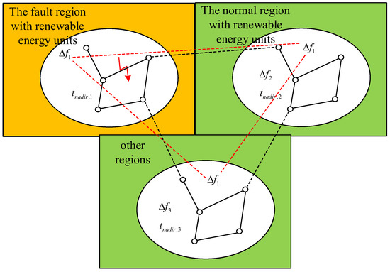In the interconnected system of regions with renewable energy sources, the electrical distances of wind farms and photovoltaic power stations have a significant impact on the frequency deviation distribution at the fault node. Some regions have a high proportion of renewable energy units. If a fault occurs in such regions, problems may arise. Wind farms and nearby photovoltaic power stations are strongly electrically coupled. They have low inertia and weak frequency support capacity. As a result, after a fault occurs, relatively large frequency deviations may be induced. Suppose a fault occurs in regions far from these areas. The transmission of the fault impact is then slower. In this case, the frequency deviation mainly depends on nearby synchronous generators and loads. As a result, the deviation is relatively small. There are two elements that can reflect the spatio-temporal distribution characteristics of the interconnected system’s frequency response. One is the node frequency deviation index within the same time. The other is the arrival time of the maximum frequency deviation. As shown in Figure 1, after the fault occurs, three types of frequency deviations are formed in the three regions within the same time, and the arrival times of the maximum frequency differences are different.