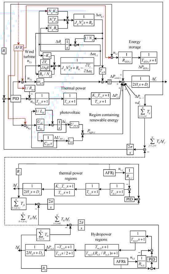 In MATLAB 2020a/simulink, a three-region interconnected power system as shown in Figure 2 is built to conduct a simulation study on the participation of renewable energy units in AFR. In the simulation system, the installed capacity ratio of the thermal-power area, the hydropower area, and the renewable energy area is 3:2:2. In the renewable energy area, the proportion of renewable energy is 80%, and the ratio of wind power, photovoltaic power, and energy storage is 6:3:1. The control equations for thermal power and hydropower can be found in Ref. [8], and the specific parameters of the system are shown in Table A2, Table A3 and Table A4 of Appendix A.