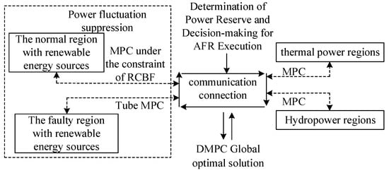 - When a fault occurs in a region with renewable energy, aiming at the adverse impact of power fluctuations on the control when renewable energy participates in AFR control, a control algorithm of tube MPC is proposed. This algorithm enables renewable energy units in the fault region of renewable energy to cope with the uncertain fluctuations of renewable energy. At the same time, the DMPC algorithm is applied to the units in other areas. The simulation shows that this method can achieve real-time optimization of the overall system and improve the control accuracy. Faults may occur in regions of conventional units. When this happens, renewable energy units in renewable energy regions can take action. They reduce the impact of uncertain renewable energy fluctuations. They do this while meeting the constraints of RCBF control parameters. This endows these units with AFR capability. As a result, it ensures the frequency stability of the local region and provides frequency regulation resources.