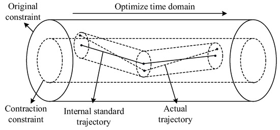The control principle of Tube MPC is shown in Figure 4. Tube MPC consists of two cascaded MPCs. The inner MPC control defines the reference trajectory using the traditional predictive control method with strict constraints. The outer MPC guides the state of the uncertain system towards the reference trajectory to form the actual trajectory. Therefore, over the entire optimization time domain, the actual trajectory of the system is always constrained within a “tube”.