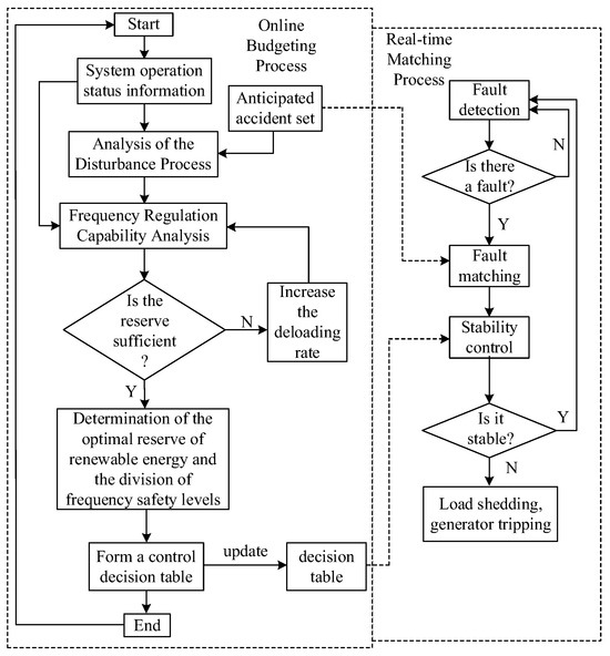 In a system containing renewable energy sources, it is necessary to determine the optimal deloading rate of renewable energy units to ensure that the system has sufficient power reserves and guarantee the feasibility of renewable energy participation in the AFR. Aiming at the problem of determining the optimal deloading rate of renewable energy sources, this paper constructs an improved AFR control framework based on the principle of “online budgeting and real-time matching”, and the specific process is shown in Figure 5.
