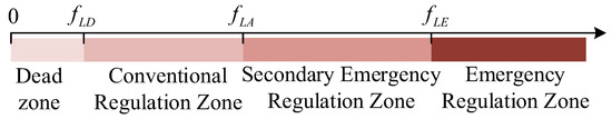 The zoning of Δfmax is shown in Figure 6. fLD is the critical frequency of the dead zone, fLA is the critical frequency for auxiliary regulation, and fLE is the critical frequency of the emergency regulation zone. When Δfmax < fLA, the system is regarded as being in a normal operation state, and each unit can deal with it by using feedback control. When Δfmax > fLA, the system is regarded as being in a fault state. In order to prevent the maximum frequency deviation from exceeding the threshold, conventional units and renewable energy units implement AFR, and additional support from energy storage is required when the fault is severe. By combining with the aggregated analysis in the offline scenario, the specific control strategy of AFR is obtained, and the practical application of the AFR control method for renewable energy is realized.