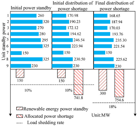 There are 10 adjustable conventional units in the thermal power area. If one of the units trips due to a fault, a power shortage of 950 MW will occur. The system follows the N-1 principle after an accident, that is, the system remains stable after tripping. After calculation, the maximum frequency deviation exceeds the set critical frequency for auxiliary regulation of 0.3 Hz, reaching 0.351 Hz. Therefore, it is necessary to use the renewable energy area for power support. If the hydropower area is not considered, the results of power shortage distribution and the required power reserve of renewable energy are shown in Figure 7.