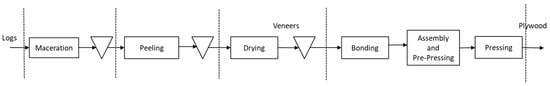 Plywood production consists of several key stages—maceration, peeling, drying, bonding, assembly, and pressing—which will be detailed in the next sections (Figure 2 and Figure 3).