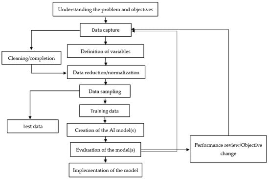 ML techniques, a subset of AI, enable capture, deployment, and intelligent analysis of data through sensors in various applications, such as predictive maintenance of industrial plants []. ML is utilized for the discovery of “hidden” knowledge from large volumes of data, whether in the form of patterns, correlations, or anomalies, and it has the capability to learn and adapt to new situations []. In an ML approach, the quality of the outcome depends, among other factors, on the number of training examples and is restricted by the type and behavior of the parameters or the interaction between response and control factors []. Moreover, the ML approach offers greater precision in predicting future actions and allows systems to learn from historical data, including both positive experiences and false positives (erroneous conclusions) []. This approach involves modeling the generic behavior of physical processes based on examples, thereby automatically concluding for other situations. In Machine Learning, the choice of algorithm is highly dependent on the nature of the problem, making multiple evaluations necessary. Figure 4 illustrates the general framework for data processing using ML.