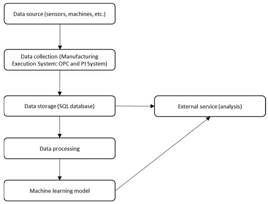 The data were obtained from an industrial process for manufacturing Pinus radiata plywood. The plant produces approximately 350,000 m3 of plywood annually. The species (Pinus radiata) sourced from the central–southern region of Chile []. The data from the OPC server were collected and stored in a PI System© (from AVEVA, Cambridge, UK) server using the PI DataLink Excel add-in. Data captured from various sensors were transmitted via PI System© to a SQL database. The methodology follows the classical steps of the ML framework (Figure 5).