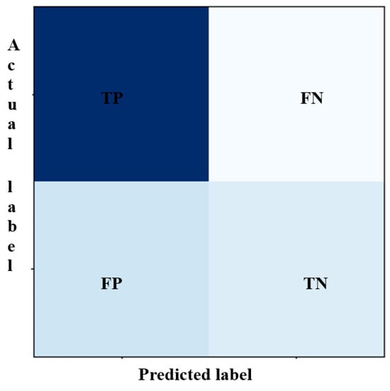 To assess the performance of the models, a confusion matrix was used [], which compares the model’s predictions with the actual class label values: true positive (TP): cases where the model correctly predicts the positive class; true negative (TN): cases where the model correctly predicts the negative class; false positive (FP): cases where the model incorrectly predicts the positive class, when the actual value is negative (Type I error); and false negative (FN): cases where the model incorrectly predicts the negative class, when the actual value is positive (Type II error) [] (Figure 6).