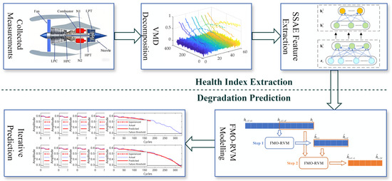 In order to improve the efficiency and accuracy of residual life predictions for complex systems such as aeroengines, a long-term prediction algorithm based on the FMO-RVM was proposed in this paper. Through the experiments conducted in a widely used and researched simulation run-to-failure database established at NASA for aeroengines and EMAs, the performance of the predictive architecture presented in this paper was verified. Firstly, an extraction method without prior knowledge was proposed using VMD and an SSAE to obtain the HI; it performed better in extracting the HI than a PCA and shallow network. Then, through obtaining multi-time prediction results through a single-step operation, the prediction method based on FMO-RVM regression proposed in this paper resulted in a reduced prediction quantity; in addition, compared with the SVM, RVM, and LSTM methods, the prediction method proposed in this paper had a higher prediction accuracy.