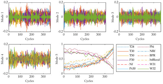 - VMD decomposition. The 12 groups of measurements obtained from the screening were decomposed by VMD; the modal number of VMD was 5. This number was chosen after experimentation to strike a balance between effective decomposition and computational efficiency. The training data decomposed by VMD are shown in Figure 3. Modes 1–4 mainly contain noise data, and mode 5 preserves the main degradation trend.