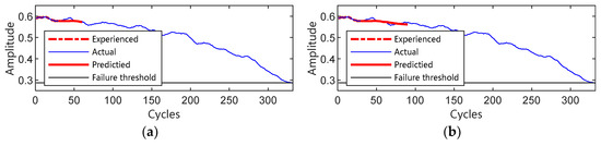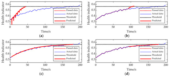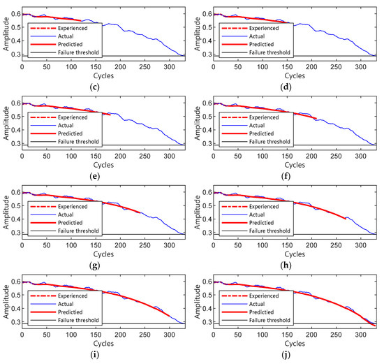 The prediction curves based on the FMO-RVM, which correspond to 10 iterations, are shown in Figure 5. The total length of the test data was 362 cycles, and the actual remaining life was 302 cycles. At this time, the input and output data dimension of the FMO-RVM used for training was 30, so 300 time periods of prediction can be achieved with only 10 iterations. In Figure 5j, the predicted data exceeds the failure threshold, the system was determined to fail at this time, and the iteration stops. The estimated remaining life by the FMO-RVM was 295, which differed from the actual remaining life by seven cycles. Overall, the FMO-RVM method is accurate in estimating the trend of the data.