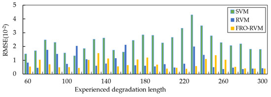 To further verify the regression prediction ability of the FMO-RVM, the FMO-RVM was compared with a traditional SVM and RVM. The training data were still used for testing here. The total degradation process length of these data was 362, and the degradation process length that occurred ranged from 60 to 300 in steps of 10. The prediction accuracy of the SVM, RVM, and FMO-RVM was compared under different lengths of existing process data. Here, the prediction accuracy was measured using the mean absolute error (MAE), mean squared error (RMSE), and coefficient of determination (R2). The calculation formula of R2 is as follows: