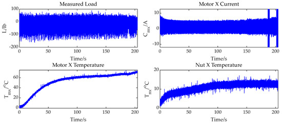 Measurement data are collected from multiple output sensors corresponding to the flight conditions, including the load, position, temperature, current, and voltage. The specific sensor names and their main parameters are listed in Table 3. The temperature is monitored using thermocouples installed in the nut and motor. The test data are acquired using the NI 6259 data acquisition card at a sampling frequency of 1 kHz. The digital acquisition card has a resolution of 32 bits. Detailed testbed data can be found in the referenced literature [38].