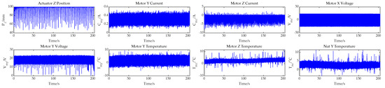 As the system warms up, the temperature typically increases gradually and stabilizes at a relatively constant level. However, any abnormal or rapid temperature rise, especially under steady load conditions, may indicate potential faults such as internal friction or mechanical degradation. This is particularly evident in the X-axis motor temperature and X-axis nut temperature, where significant temperature increases were observed. Meanwhile, data anomalies occurring at the moment of system failure can be identified from the X-axis motor current and Y-axis motor voltage. These anomalies, often characterized by irregular spikes or dips, help pinpoint the exact moment when the system begins to fail.
