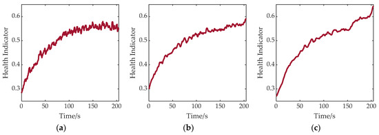 Health indicators extracted under different numbers of modes: (a) number of modes = 5; (b) number of modes = 10; and (c) number of modes = 20.