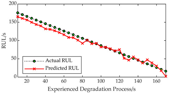 Figure 11 shows the comparison results between the remaining useful life prediction results of the prediction algorithm proposed in this chapter and the actual remaining useful life. The length of the existing process data ranged from 10 s to 170 s, and the corresponding actual remaining useful life ranged from 176 s to 16 s. It can be seen that, even when there was only 10 s of process data at the beginning, the predicted remaining useful life still had a high accuracy. When the process data were around 80 s to 140 s, the predicted remaining useful life was the most accurate. When the process data were from 150 s to 160 s, the prediction deviation was the largest, but it was still within a relatively small range and was corrected in the last segment. Taking all time periods into account, the algorithm proposed in this section can predict the remaining useful life well with a high accuracy.