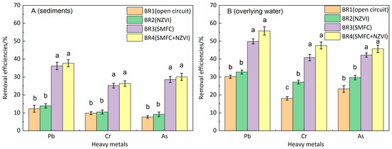 The removal efficiencies of Pb, Cr and As in sediments (A) and overlying water (B) after 60 days of operation (p < 0.05).