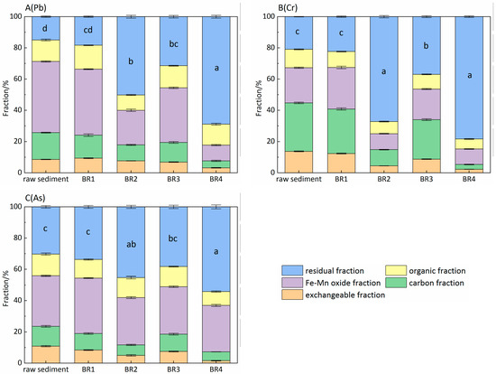 Fractions of (A) Pb, (B) Cr and (C) As in sediments of BR1 (open circuit), BR2 (NZVI), BR3 (SMFC) and BR4 (SMFC + NZVI) after 60 days of operation (p < 0.05).
