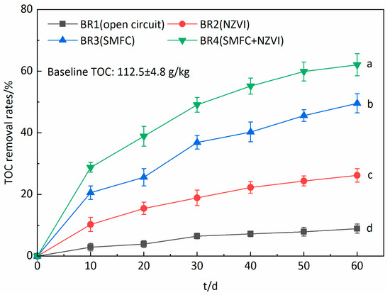 In our previous research, the combination of NZVI and electrodes demonstrated a synergistic effect in degrading organic compounds [15]. The removal efficiencies of TOC in sediments by the operation of BRs are illustrated in Figure 4. A statistical analysis on the TOC removal rates after 60 days from different BRs was performed (p < 0.05).