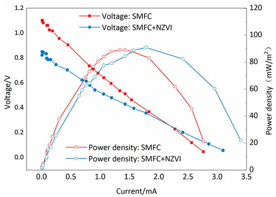 Power density and polarization curves of SMFCs with and without NZVI addition.