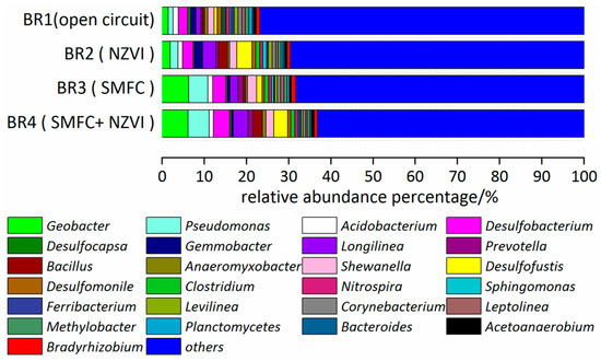 Comparing the data in Table 2 with previous studies, both the richness and diversity parameters indicated that the diversity of microorganisms in sediments contaminated by heavy metals is generally lower, which may be due to the inhibitory effect of the heavy metals’ toxicity on the microbial communities [4,38]. Compared to BR1 and BR2, it was observed that the addition of NZVI reduced the diversity of the microbial community. The community diversity in the sediment of BR4, while is not as rich as in BR3, has increased compared to BR2. This indicated that operating a SMFC can mitigate the adverse effects of NZVI on community diversity. In our previous study, we found that the electrode can increase the content of electrogenic bacteria, which can also be shown in Figure 6 [4,10]. As is shown in Figure 6, Geobacter constituted the majority of the microbial community in BR3 (6.29%) and BR4 (6.15%), with levels exceeding those in BR1 (1.48%) and BR2 (1.92%). Furthermore, a higher prevalence of Pseudomonas species was observed in BR3 (4.59%) and BR4 (4.98%) compared to BR1 (1.14%) and BR2 (1.85%), which is likely due to the involvement of alternative anodes acting as electron acceptors.