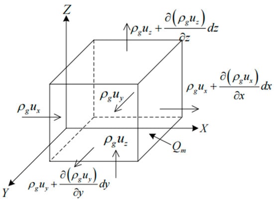 Figure 1. Gas mass conservation in the coal body. Qm represents the source term, which is taken as 0 in this study; ux, uy, uz represent the seepage velocities in the x, y, and z directions, m/s; ρgux, ρguy, ρguz represent the seepage fluxes in the x, y, and z directions, in kg/(m2·s).