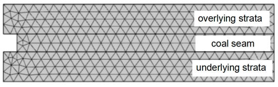 As the coal body located farther from the mining face experiences minimal mining-induced disturbances, this study focuses on the region extending from 0 to 100 m in front of the mining face. The geometric model adopted in this study is illustrated in Figure 2. The model represents a rectangular domain measuring 100 m in length and 26 m in width, with a coal seam thickness of 6 m. A 5 m wide excavation zone is positioned at the leftmost boundary of the model to simulate mining activity.